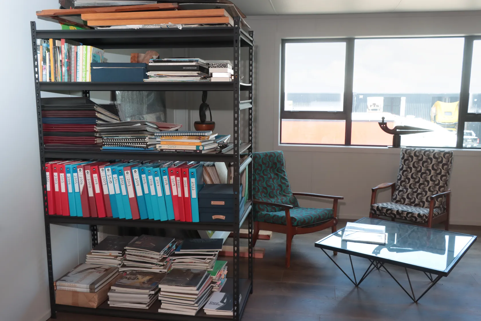 Located at the Dibble workshop is a designated room where the Paul Dibble archives are stored. This archive consists of hard copies of the database of artworks; catalogues; scrapbooks holding exhibition installation images, invitations and reviews; articles; film footage and ephemera.
